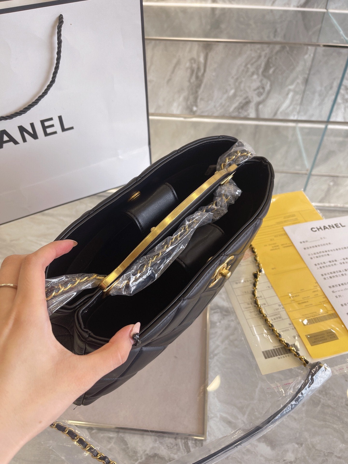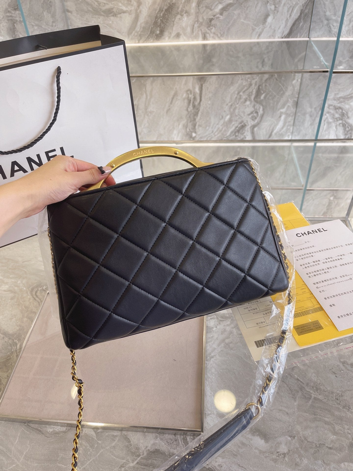 Includes Shipping bags, dustbag sleeper, care manual, booklet, tag.